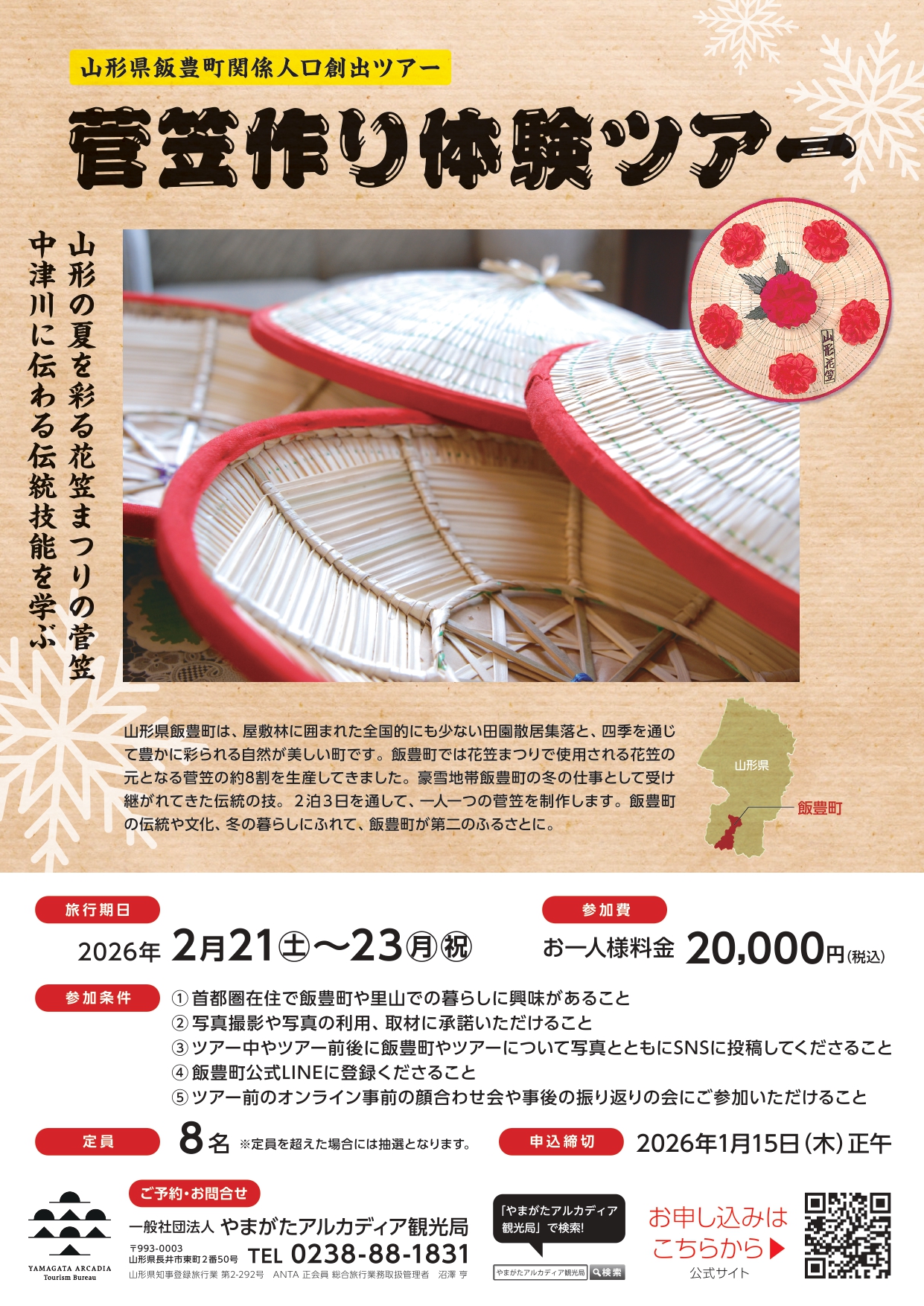 年々と担い手は減少してきており、このままでは長年培われてきた技術が失われてしまう可能性があります。このツアーでは、菅笠作りについて現地の方々からお話を聞きしながら、実際に自分の手で一つの笠を縫い上げ、菅笠を通して飯豊町を知っていただくことを目的に開催されます。